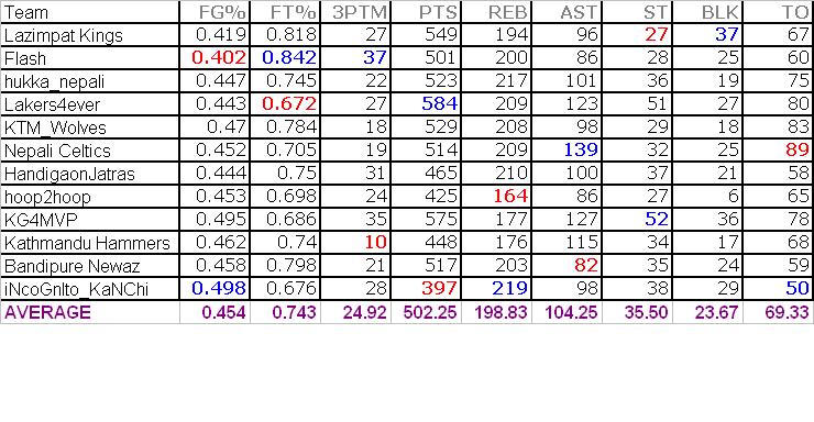 9th Nepali Celtics. Well managed team but not a good assembly of players. K. Garnett's name is the only name that stands out. Peja's productivity has gone down considerably and with him being out the team is in a decline now. Recently the team has increased its production on 3 major categories, points, rebounds and assists but with second best player out, the incline will suffer.