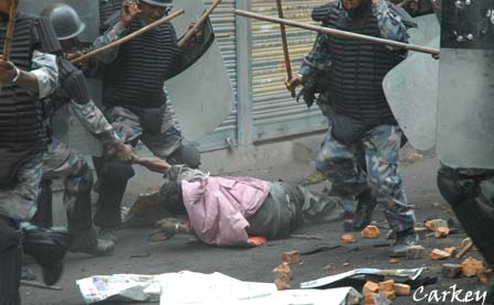 There is a saying that your eyes will see what you what to see. I think that applies to you Jai Nepal bro. So you think that those police are not beating that little boy ...well than can you explain why is he crying like that ?..and why is that one police is lifting his Stick(lathi), is he trying to straighten him and rest are trying to stop by their boots? And what about your previous post about giving lesson to those kids and those khates in nepal. I have nothign but Pitty for some moran like you who don't even spare little kid like this one in the name of poltics. It is not Girija or prachanda or some fu(ked up politician that is problem in Nepal, it is some educated (I assume you are little) that is a big problem of Nepal.
