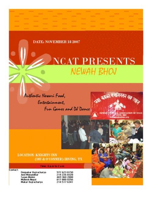 NCAT (NEWAR CULTURE ASSOCIATION OF TEXAS) IS ORGANISING A DIPAWALI PARTY IN DALLAS ON NOVEMBER 18TH ,2007...LOCATION IS KNIGHT INN( 183 AND O'CONNER)...EVERYBODY IS INVITED..