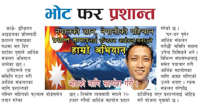 भारतीय टेलिभिजन सोनीबाट प्रसारित 'इन्डियन आइडल' का एक प्रतियोगी प्रशान्त तामाङ नेपालीका लागि अपरिचित नाम रहेन । शुक्रबार रातिको कार्यक्रममा जब उनी रोए, उनीस“गै लाखौं नेपाली रोए र रातभर जागा भई तिनै नेपालीभाषी छोरालाई जिताउन लागिरहे । आखिर मानिस किन यसरी मरिहत्ते गरिरहेका छन् - किन आफ्नो समय र पैसा सिध्याइरहेछन् - प्रशान्तमा त्यस्तो के छ - किन उदितनारायण झा खुला रूपमा उनको पक्षमा लागेर अनेक उपेक्षा सहिरहेछन् - यस्ता प्रश्न धेरैले गरिरहेछन् । यसको एउटै जबाफ हो- आज भारतीय मूलका सम्पर्ूण्ा नेपाली प्रशान्तस“गै आफ्नो अस्तित्वका लागि लडिरहेछन् ।