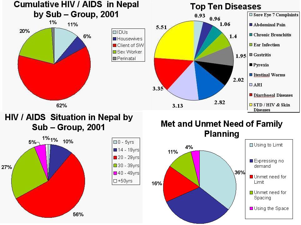 "One of the rising group of infected also happens to be the business entrepreneurs of Nepal who went aborad to :conduct business" and came back to Nepal and either infected their wives or other women in the comunity" So, these people you are referring to are basically clients of sex workers. I agree with you that wives of these pondscums who go abroad and have sex with prostitutes are totally innocent, and I completely sympathize with innocent people who become infected due to the actions of their husbands/boyfriends/spouses, etc. Did you read Arko's post above, the one where he posted pie-charts that break down AIDS in Nepal by subgroups? Look at the first one(the one on the top-left). As you can see, individuals who contract AIDS fall under three MAIN categories: 1)sex workers 2)clients of sex workers and 3)IDUs(probably intravenous drug users). They, in total make up 93% of HIV cases. Do you get it now? Just answer this question. What's the use of having these people around? Furthermore, the people they infect aren't model citizens either. The HIV virus mutates so fast that most drugs prove useless in the long-haul. There are those that are useful in the short-term, but after that most of them prove to be useless because the virus mutates very quickly. Only 6% of those infected are housewives. So these entrepreneurs with wives fall under this category. Furthermore, not all 6% of them are entrepreneurs or rich. We need to focus on the innocent and forget the rest. Sorry, I have no sympathy for people who engage in extramarital affairs, or have sex with prostitutes. These people deserve a slow, painful death. Anyways, these innocents are collateral damage IMHO. BTW, why is AIDS called a disease of poverty? In America, African Americans are hit the hardest by AIDS. It is all about poverty, my friend. There is only one way you can fight AIDS and that is education. People living in poverty are not Nepal's cream of the crop,and nothing can be done about them. This is how I feel. In some African nations a big percentage of people are infected with AIDS. It's because they are not educated, as a result of which they don't practice safe sex. It is the poor that are affected the most by poverty--people who don't practice safe sex. Nature is practicing eugenics. The rest of us can just sit back and relax.