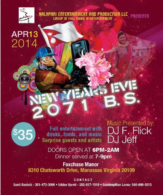 Celebrating Nepali New Years Eve with exclucsive cultural show, music, and dance with surprised artists and guests.
