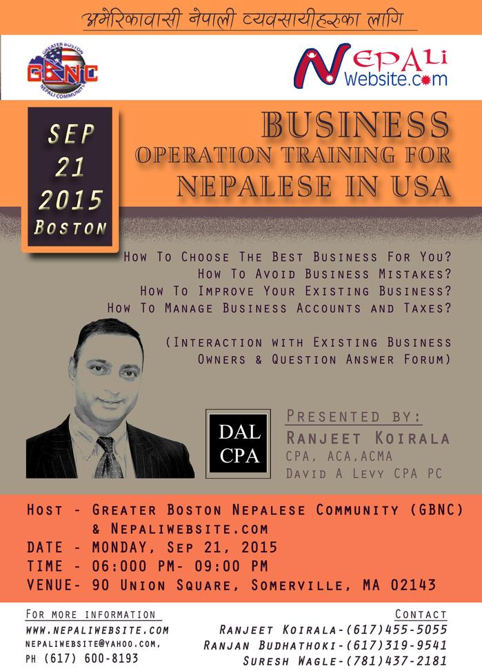 ग्रेटेर बोस्टन नेपाली कम्युनिटी(जिबिएनसी) र नेपाली वेबसाइट डटकम(www.nepaliwebsite.com/))ले बोस्टनमा एक दिने व्यवसायिक तालिमको आयोजना गर्दैछ । नि:शुल्क प्रवेश गर्न पाइने सो कार्यकमबाट हाल व्यबसाय सुरु गरिरहेका र व्यवसाय सुरु गर्न चाहनेहरू सबैले फाइदा लिन सक्नेछन् । लेखापाल (सि.पि.ए.) रञ्जीत कोइरालाको प्रस्तुति रहने कार्यक्रममा छलफल र प्रश्न/उत्तरको कार्यक्रम समेत राखिएको छ । कार्यक्रममा चियापानको ब्यवस्था पनि गरिएको छ ।
