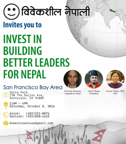 सम्पर्क: आलोक सुबेदी, वेस्ट कोस्ट संयोजक, विवेकशील नेपाली दल फोन: (४०२) ३२१ ८०७६